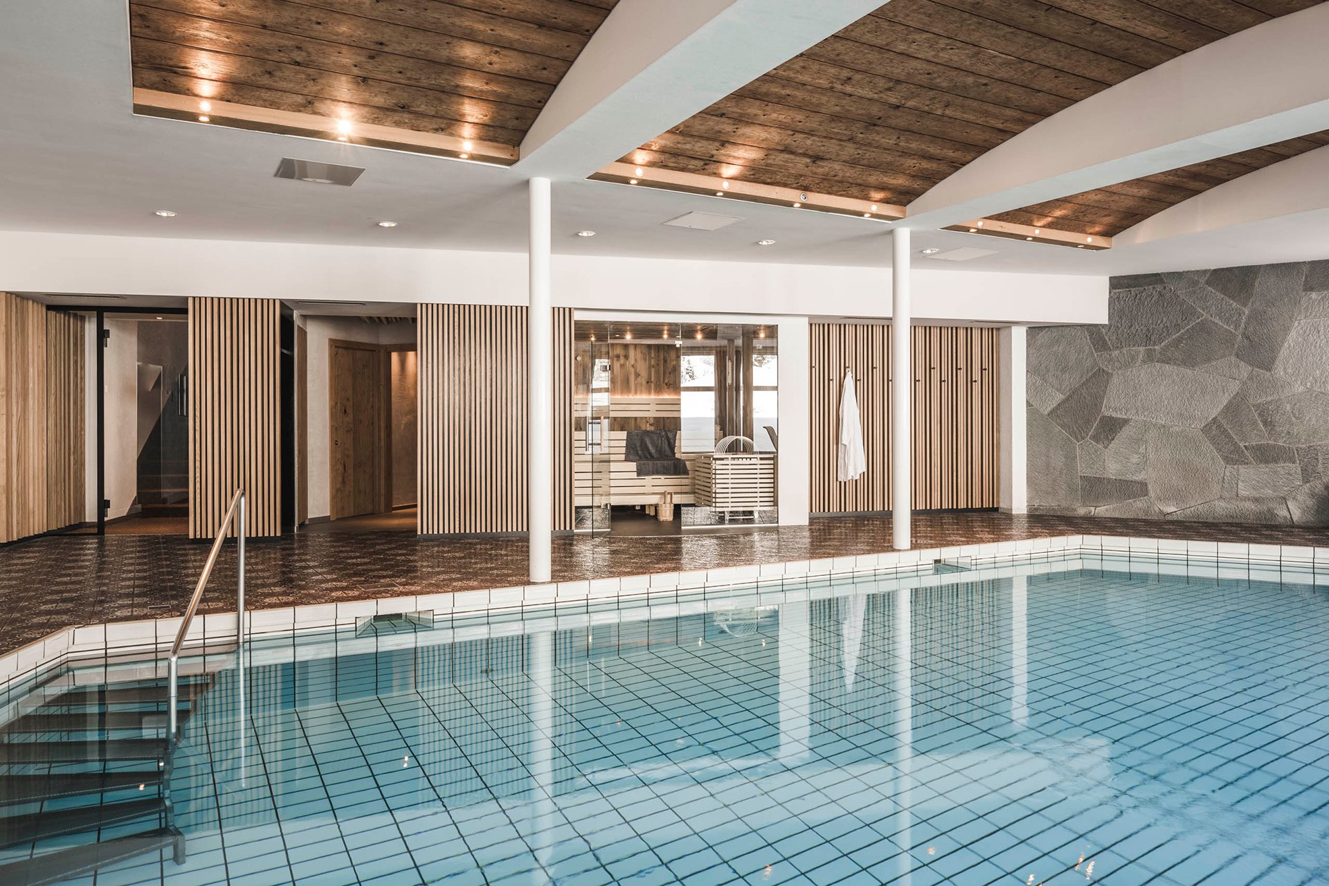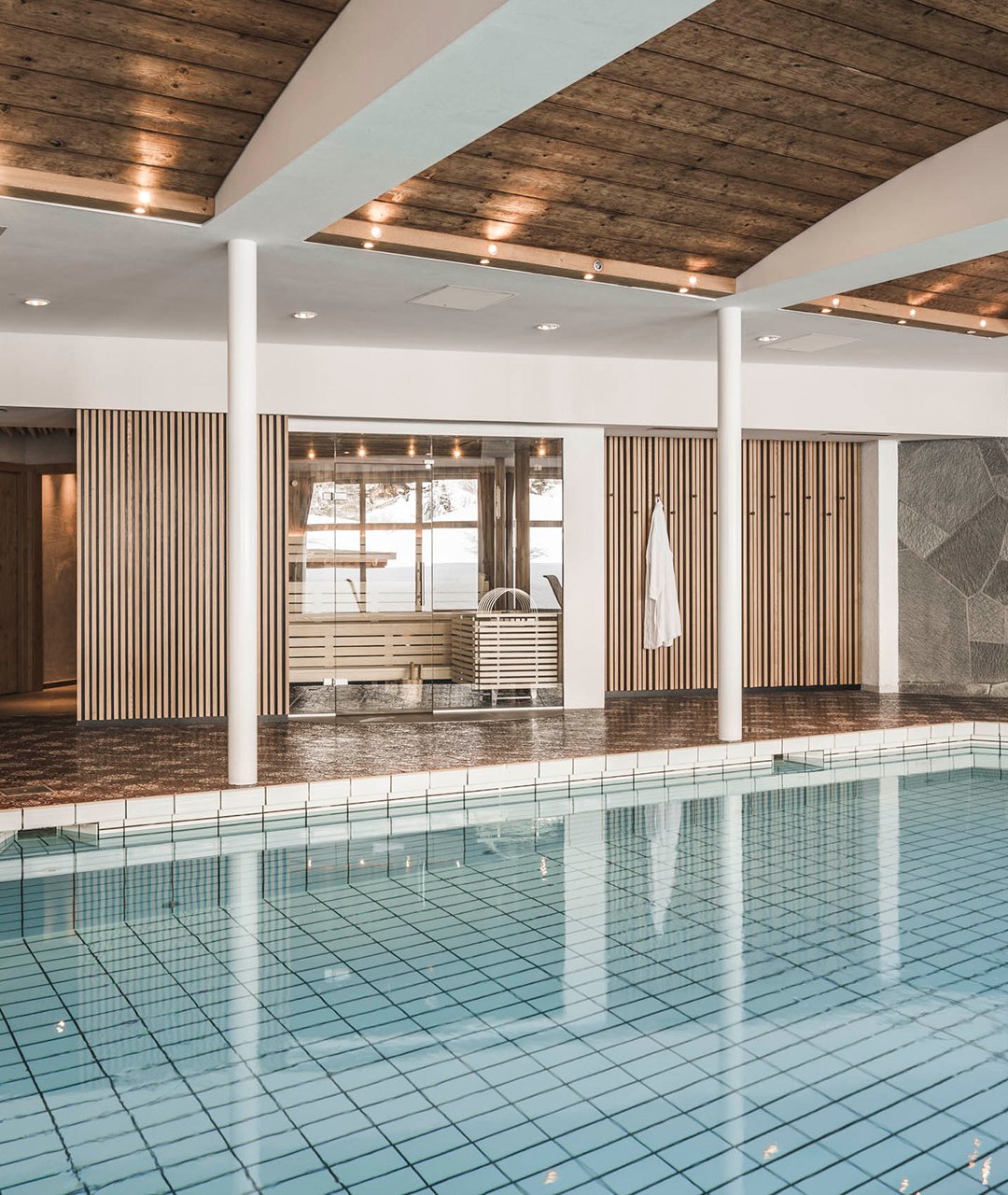 Wo Frühaufsteher ihre sportlichen Runden ziehen und Kinder fröhlich planschen: unser lichtdurchfluteter Indoorpool ist auf wohlige 29 Grad beheizt. Wer sich hier erfrischt, genießt nicht nur einen atemberaubenden Blick auf die Alpen Rongg und Röbi – sondern hat auch die Familiensauna immer im Blick. Damit Groß und Klein pure Entspannung finden. Und wer die Sonne auf der Haut spüren möchte, freut sich über den direkten Zugang zur großen Liegewiese im Grünen.