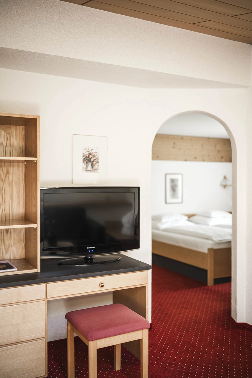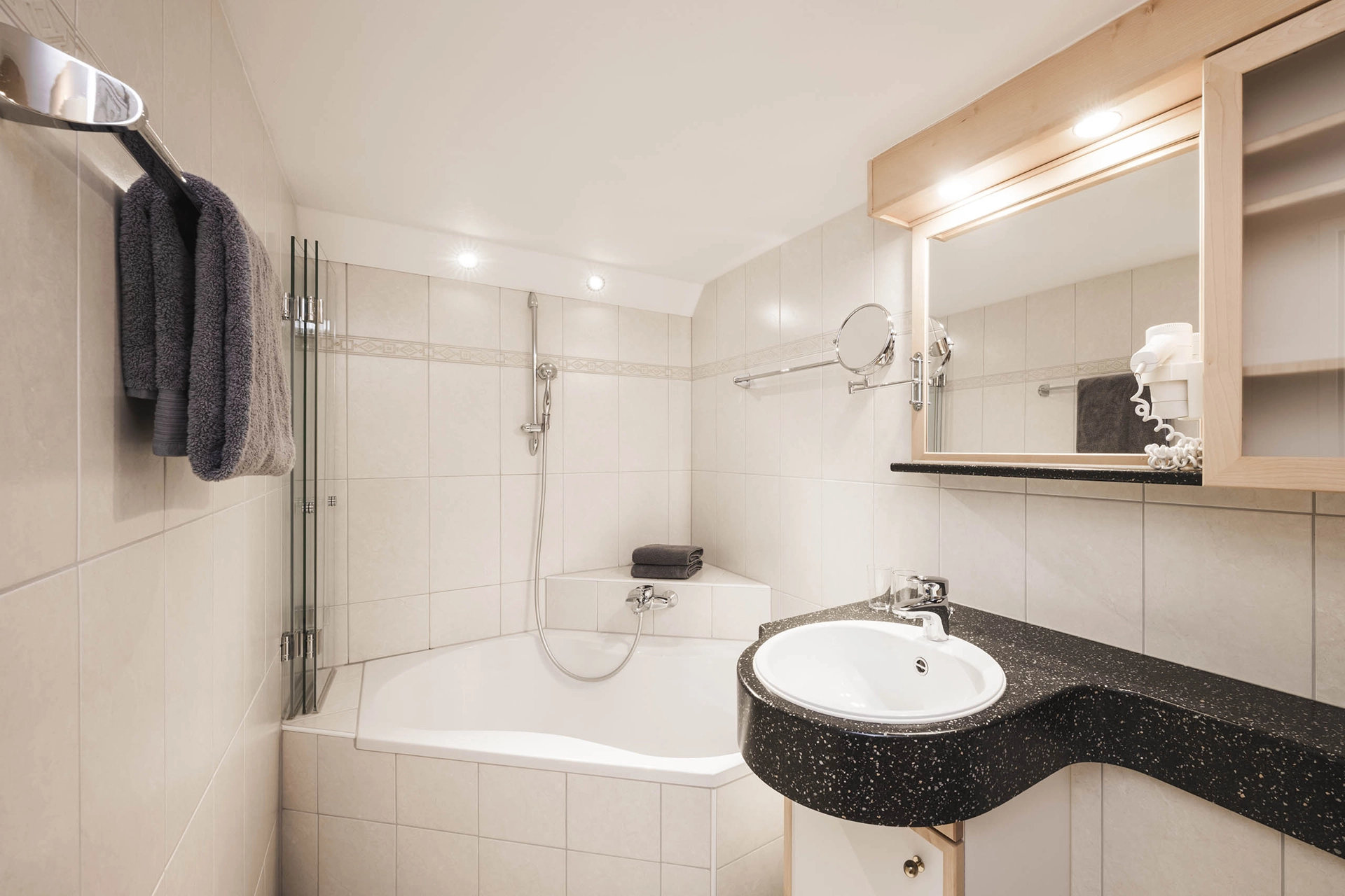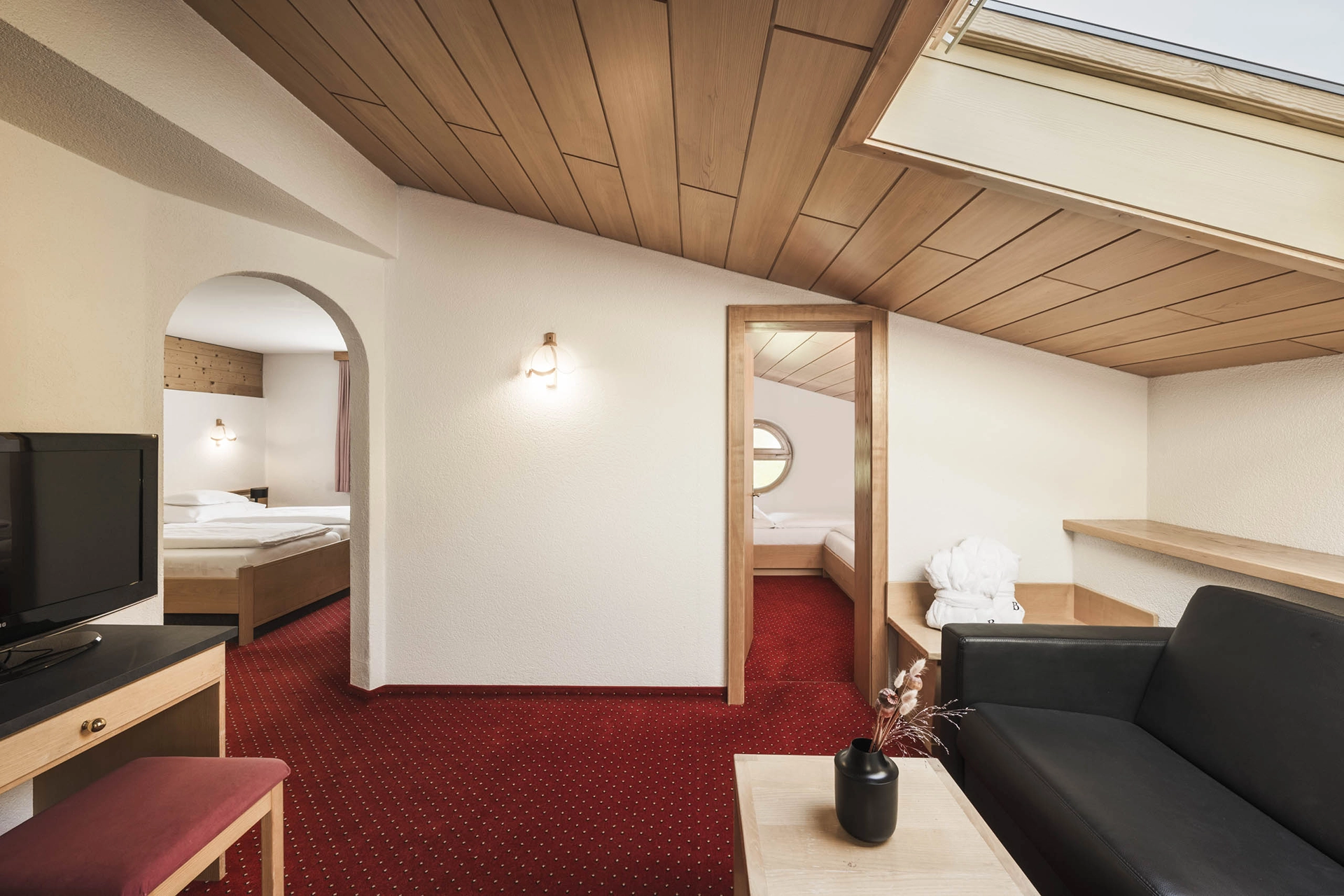 Im Wohnbereich mit Ausziehsofa und Schreibtisch kommen alle zusammen. Das Bad ist mit einer großen Eckbadewanne ausgestattet, dazu gibt‘s Alpenkräuter-Kosmetikprodukte aus Vorarlberg, einen Kosmetikspiegel sowie flauschige Handtücher und Bademäntel. Natürlich ist auch schnelles Wifi verfügbar, doch aus Erfahrung wissen wir: Die Kinder toben sich bei uns meist im Spielzimmer aus, nicht in der virtuellen Welt.