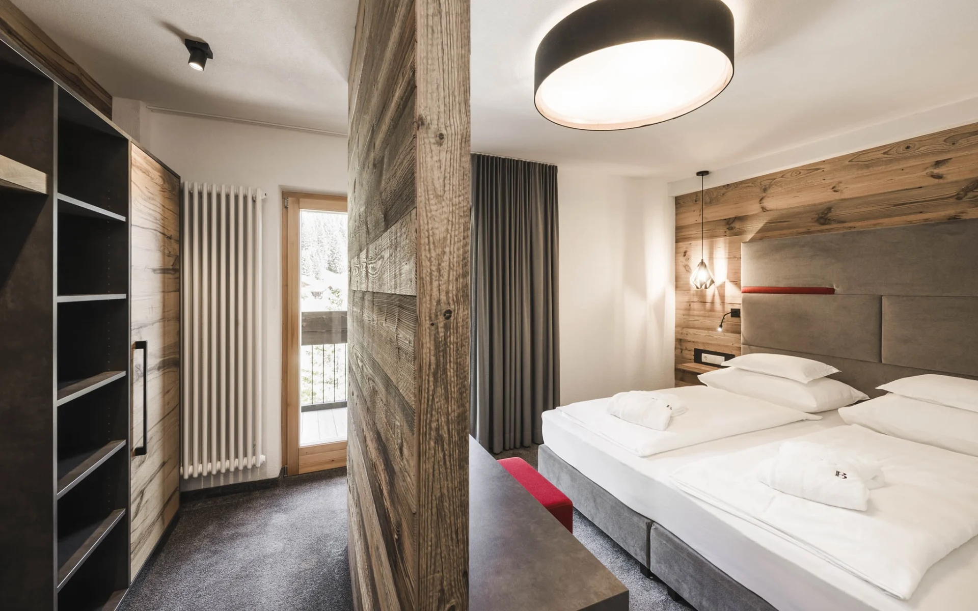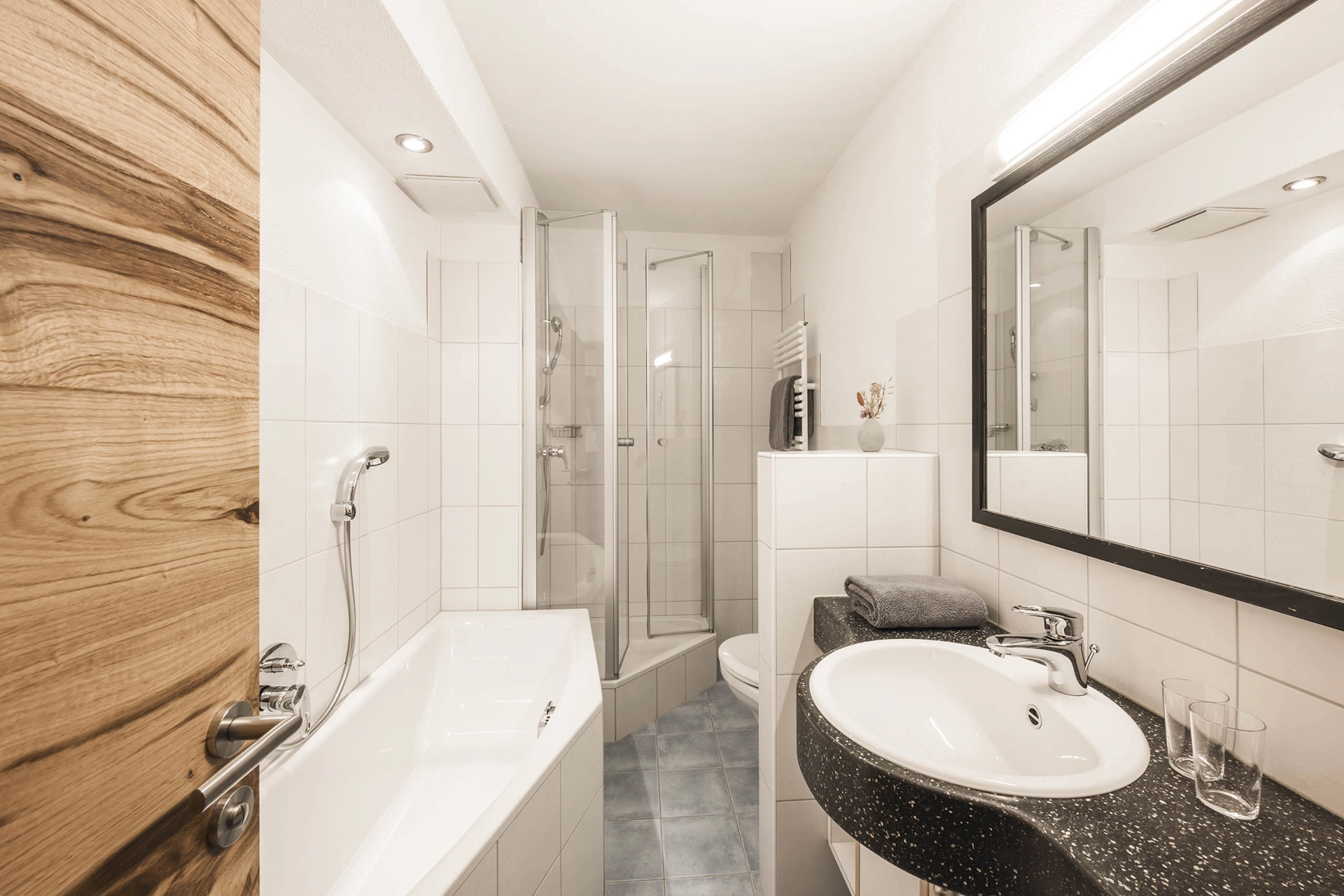 Vom Master-Bedroom mit Bad en suite blickst du auf die umliegenden Berggipfel. Im zweiten Schlafzimmer mit Einzelbett und französischem Doppelbett – ebenfalls mit eigenem Bad – kann man wunderbar abschalten. Und im großzügigen Wohnbereich kommen alle zusammen, um gemeinsame Urlaubspläne zu schmieden – der Blick von hier und vom Balkon reicht bis zu den Alpen Rongg und Röbi.