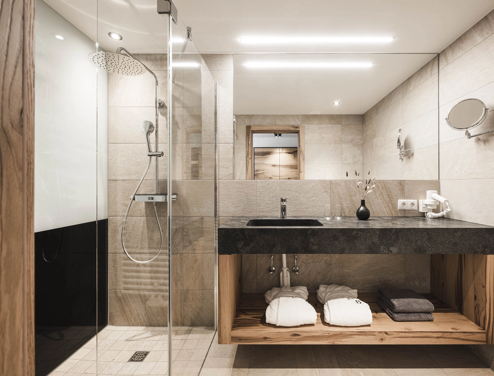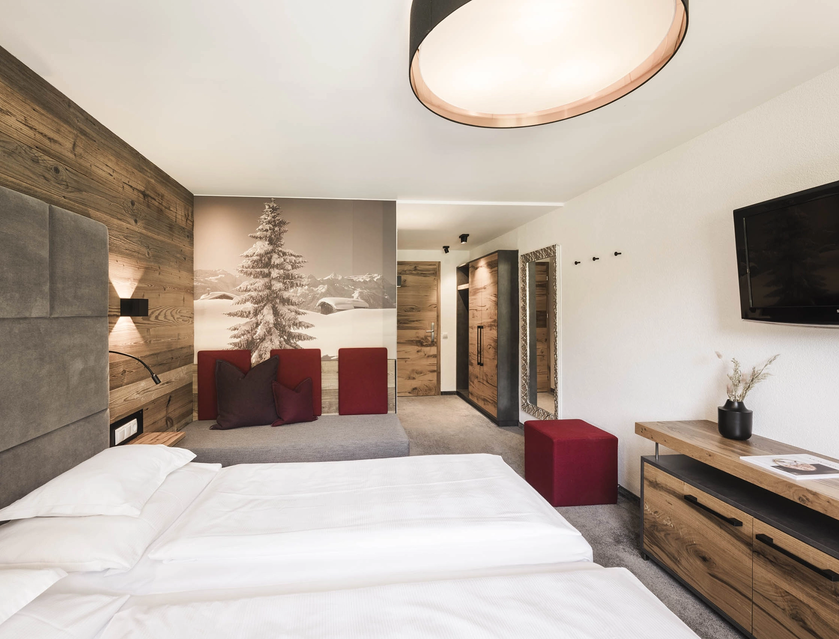 Unsere Röbi-Zimmer „Comfort“ bieten wortwörtlich mehr Komfort: Naturmaterialien wie Stein, Holz und Filz machen diese Doppelzimmer zu naturnahen Rückzugsorten – mit Balkon und Blick auf die umliegende Bergwelt. Auf dem gemütlichen Sofa kannst du deine nächste Wanderung auf die namensgebende Alpe Röbi planen und im Kingsize-Bett ganz entspannt ausschlafen. Ein modernes Doppelzimmer mit allen Annehmlichkeiten wie Badezimmer mit Dusche, Alpenkräuter-Kosmetikprodukten aus Vorarlberg, Kosmetikspiegel und flauschigem Bademantel.