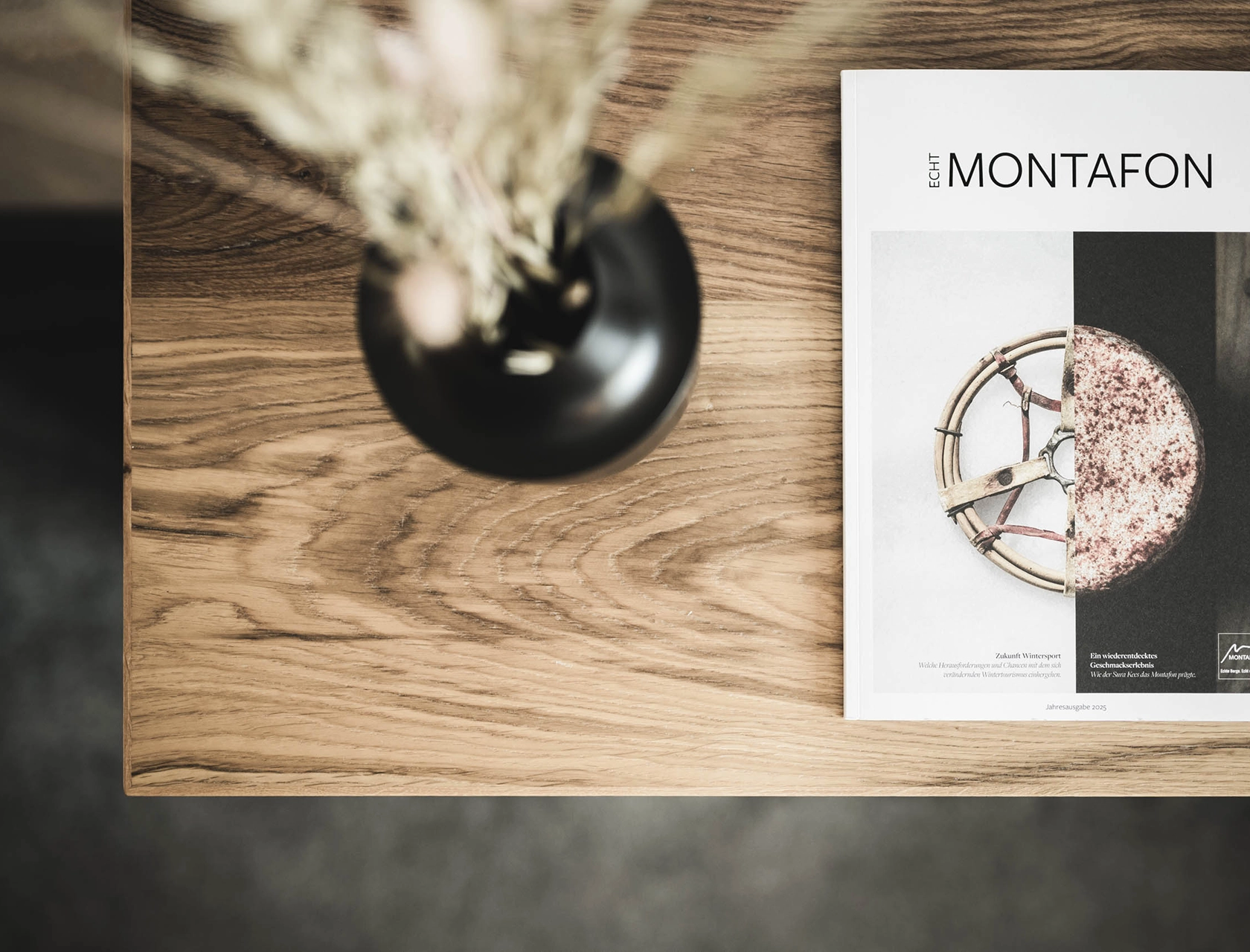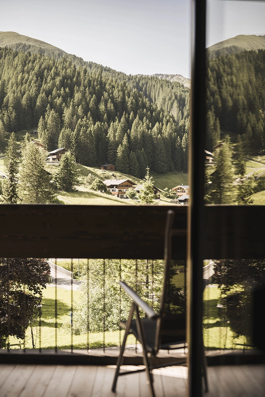 Geöltes Altholz, edler Naturstein und Filz – ein charmanter und moderner Wohlfühlraum für mehr „Comfort“ und Behaglichkeit. Mit gemütlichem Sofa und Balkon mit Blick auf die Alpe Röbi und die umliegende Bergwelt.