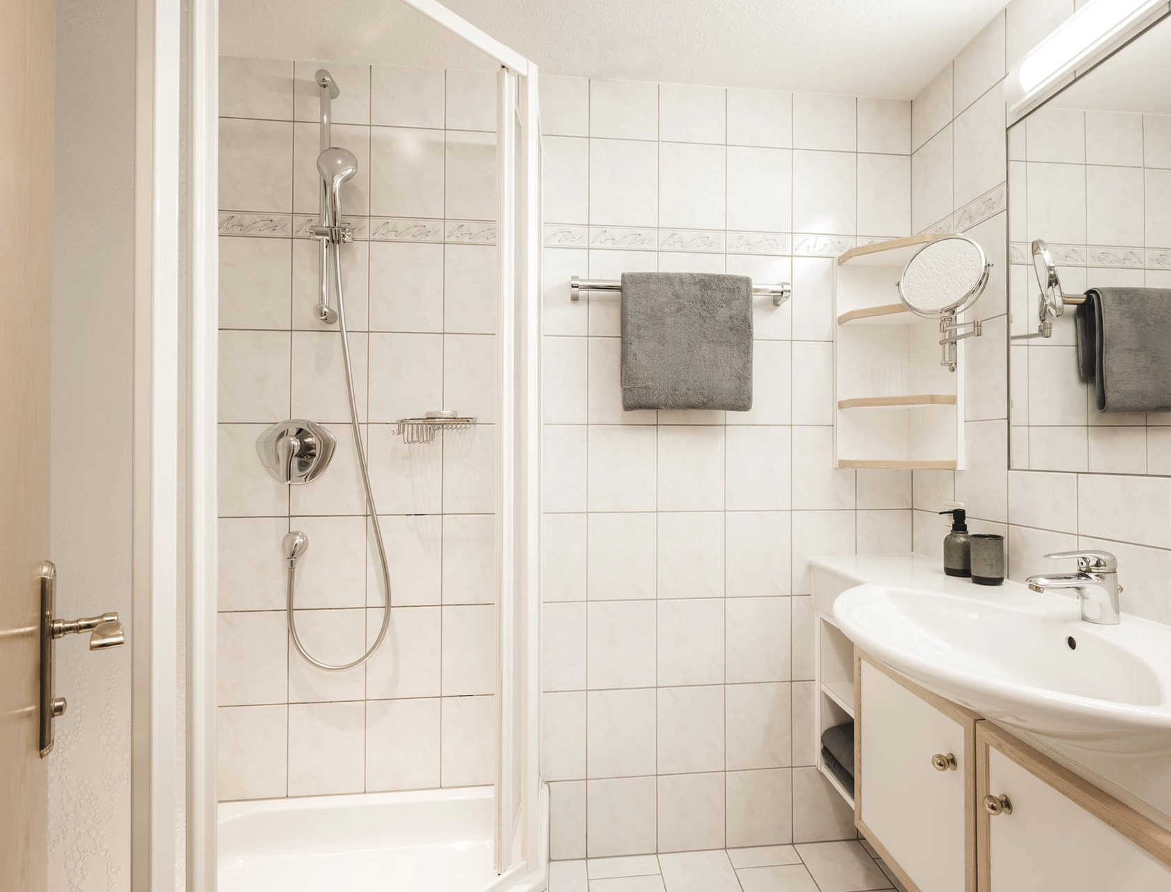 Im Badezimmer mit Dusche findest du eine Sitzgelegenheit und weitere Annehmlichkeiten wie Kosmetikspiegel, duftende Alpenkräuter-Kosmetikprodukte, Haartrockner und kuschelweiche Handtücher. Alle Schmalzberg-Zimmer verfügen über ein separates WC.