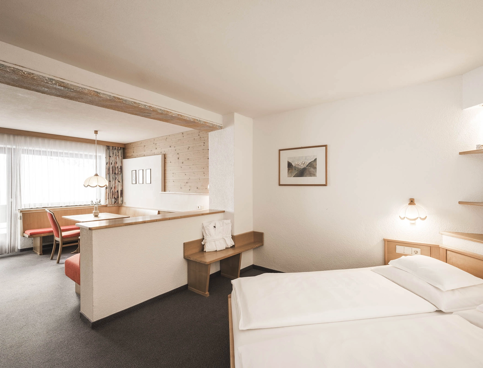 Mit großzügigen 35 m² sind die Schmalzberg-Zimmer Superior bei längeren Aufenthalten besonders beliebt. Sie bieten ausreichend Platz für einen lichtdurchfluteten Sitzbereich mit Eckbank und Tisch, einen zusätzlichen Schreibtisch und ein gemütliches Sofa zum Entspannen.