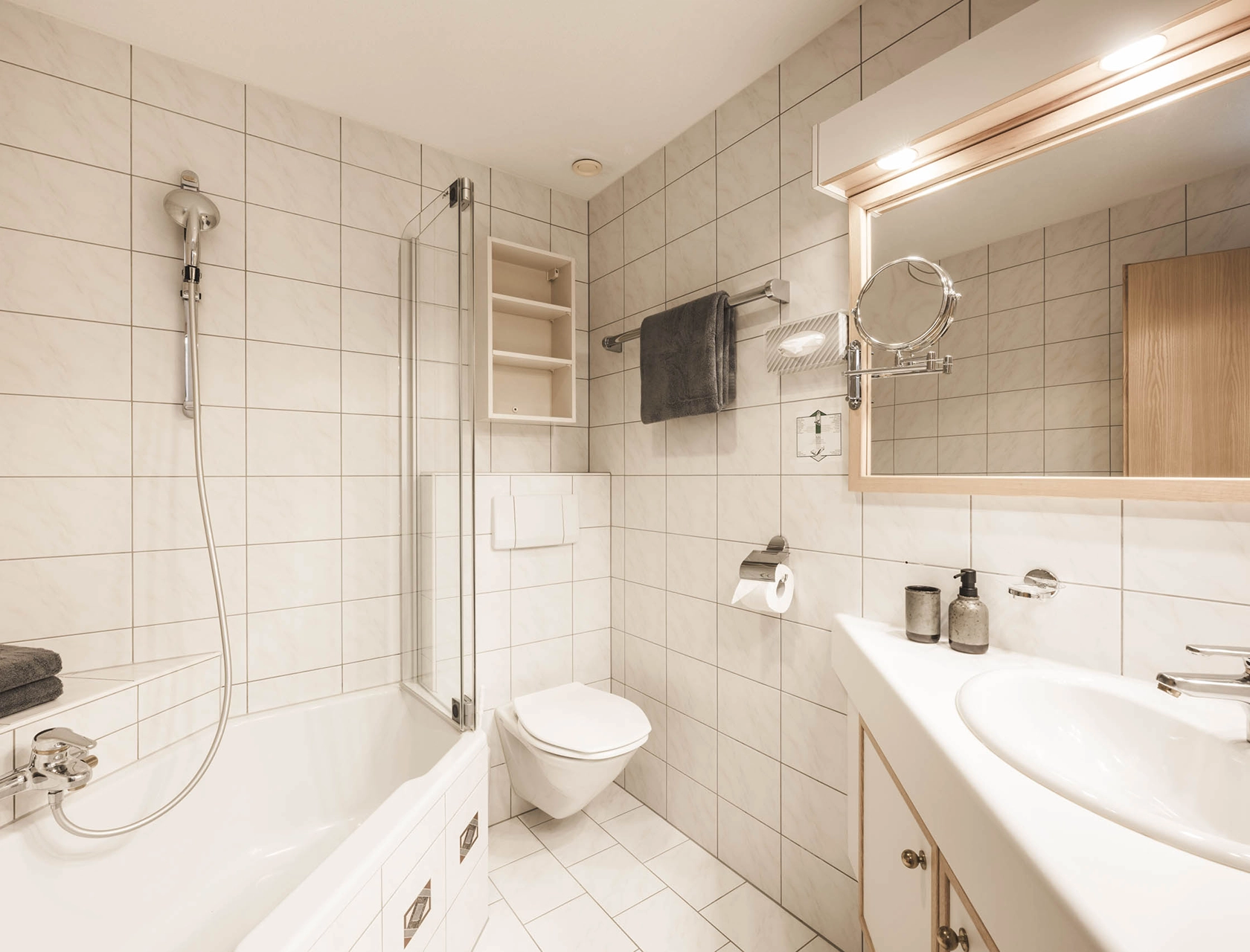 Wer die Berge liebt, genießt die wundervolle Aussicht auf die Gipfel der Ritzenspitzen und die Sonnenseiten des Lebens auf dem südseitigen Balkon. Oder entspannt im Kingsize-Bett und hochwertiger Damast-Bettwäsche. Und das Beste: eine Badewanne für entspannte Momente – und natürlich duftende Alpenkräuter-Kosmetikprodukte aus Vorarlberg, ein Kosmetikspiegel sowie flauschige Handtücher und Bademäntel.